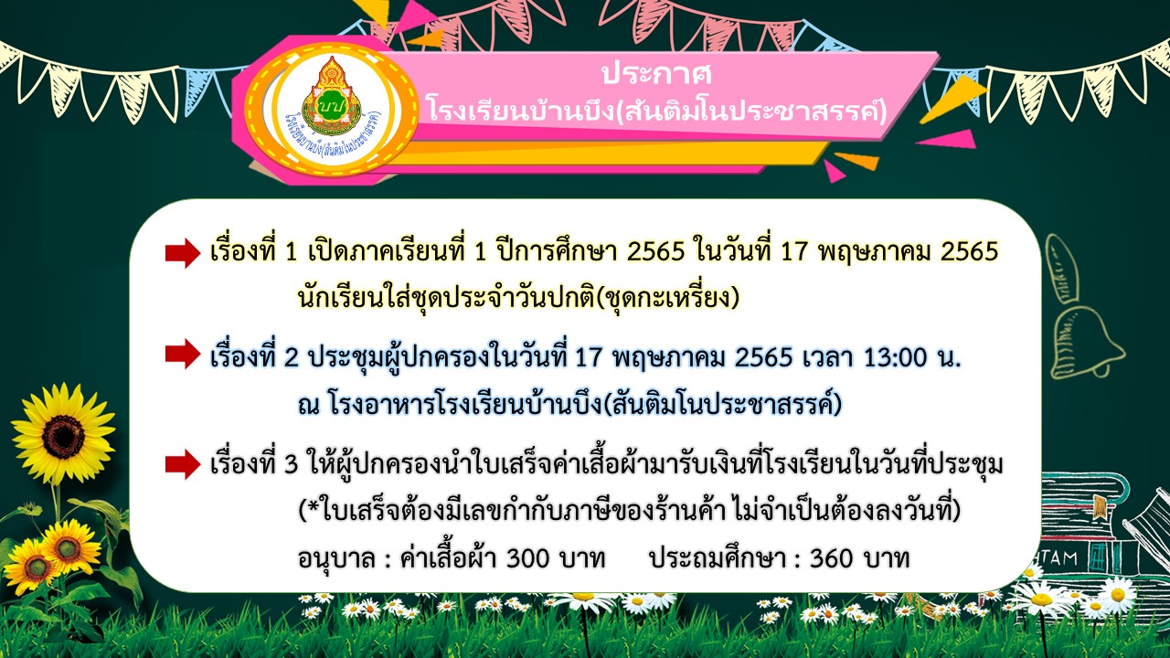 โรงเรียนบ้านบึง (สันติมโนประชาสรรค์)) ได้กำหนดวันเปิดภาคเรียนที่ 1 ประจำปีการศึกษา 2565 ในวันที่ 17 พฤษภาคม 2565 และช่วงบ่ายมีการจัดประชุมผู้ปกครองและแจกค่าเสื้อผ้าให้กับผู้ปกครอง